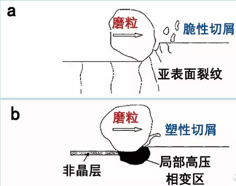 兩種脆性材料的去除機理:a脆性斷裂去除,b塑性流動去除
