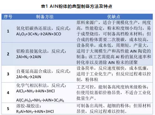 氮化鋁陶瓷的優(yōu)良性能與原材料粉體的性能有著直接的關(guān)系,高性能AIN粉體是制備高熱導(dǎo)率AIN陶瓷的關(guān)鍵。制備AIN粉體的方法有很多種(見下表1),也都存在各自的不足,但他們都有一個(gè)共同點(diǎn)就是成本較高。